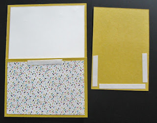 6. Adhere this combination to the front of the card. Take care to only place adhesive on the bottom of the piece so as to not glue the card shut. See the photo below for suggested positioning of the adhesive. Notice the piece of adhesive on the actual card front. This is easier than trying to figure out where to place it on the smaller piece.